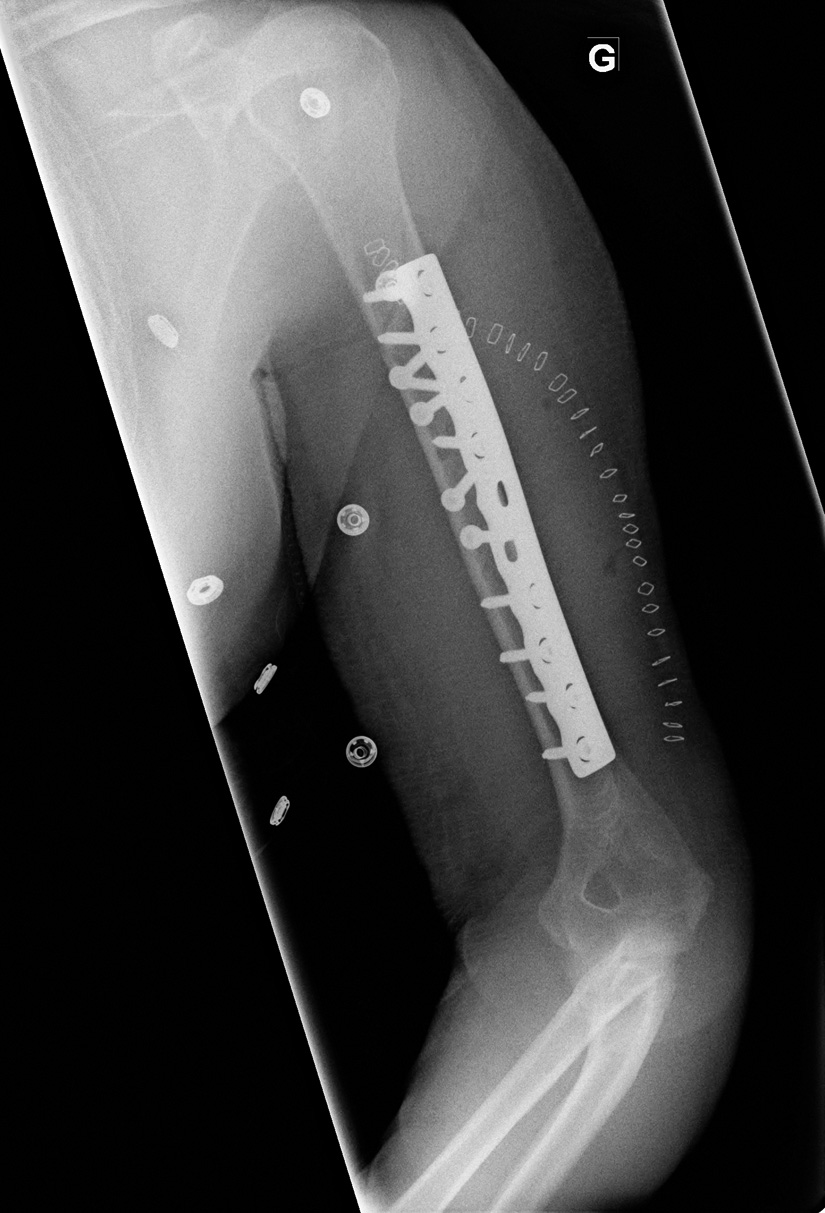 Postoperative radiograph following the open reduction and internal fixation of a comminuted fracture of the humeral shaft. The fracture is reduced to an anatomic position and 4 interfragmentary screws are installed to secure the reduction.