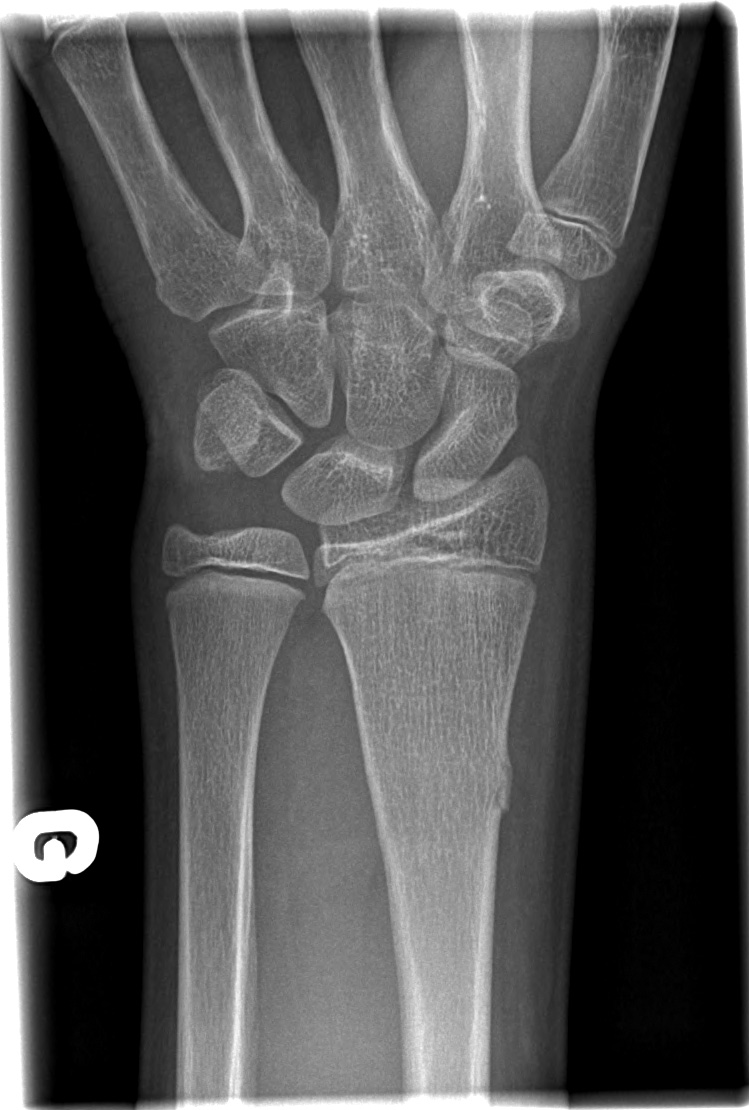 Left wrist pain after falling on a hyperextended arm and a flexed wrist.