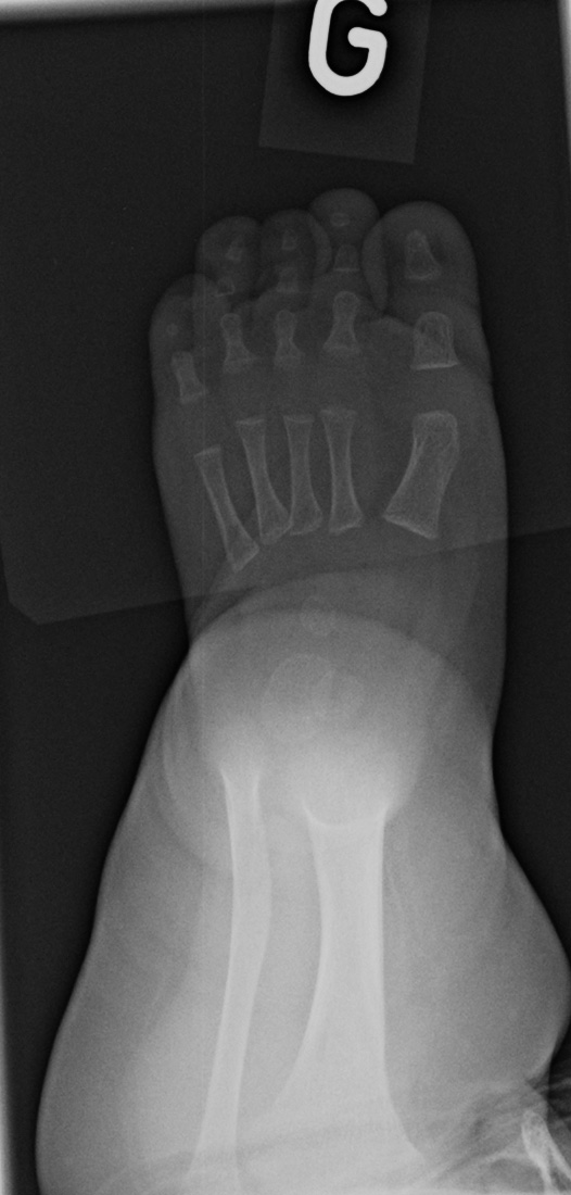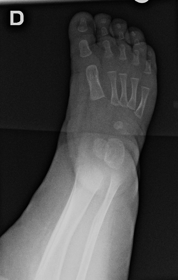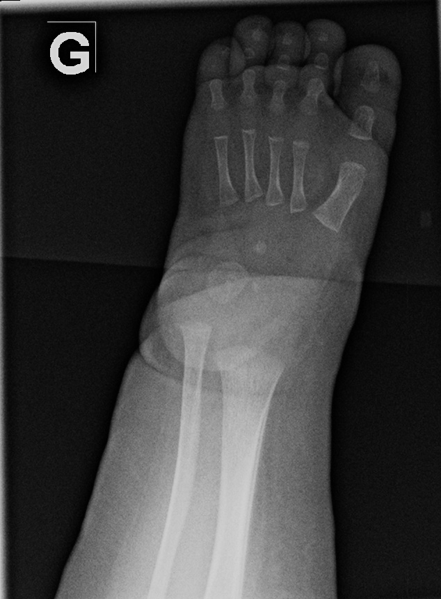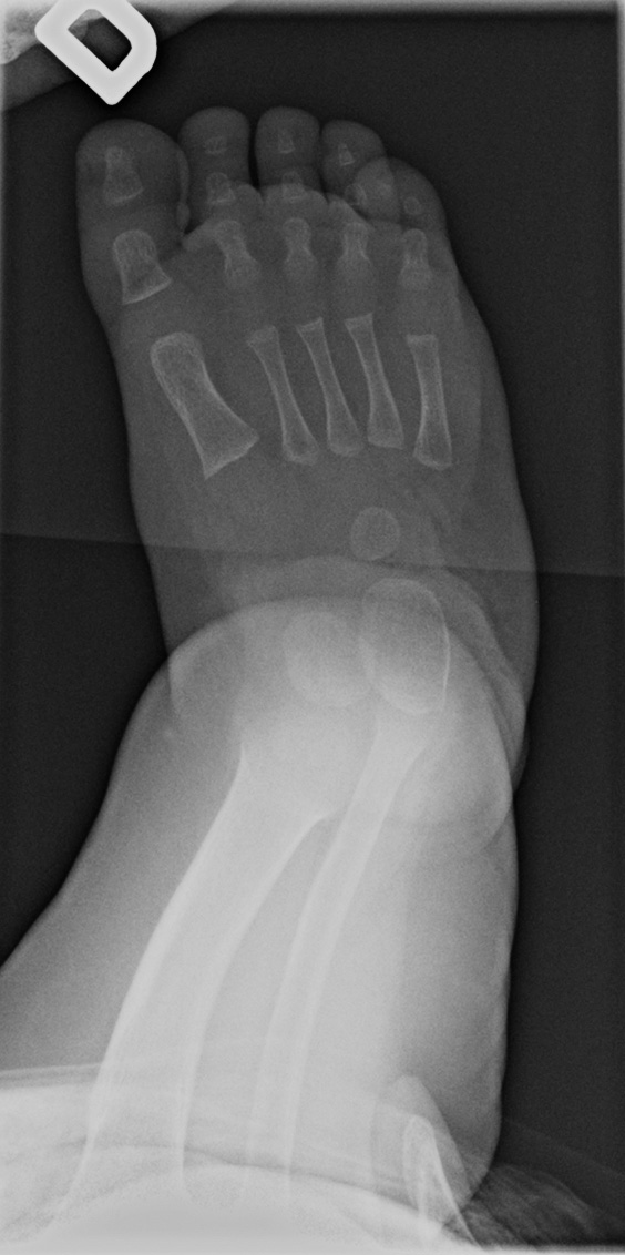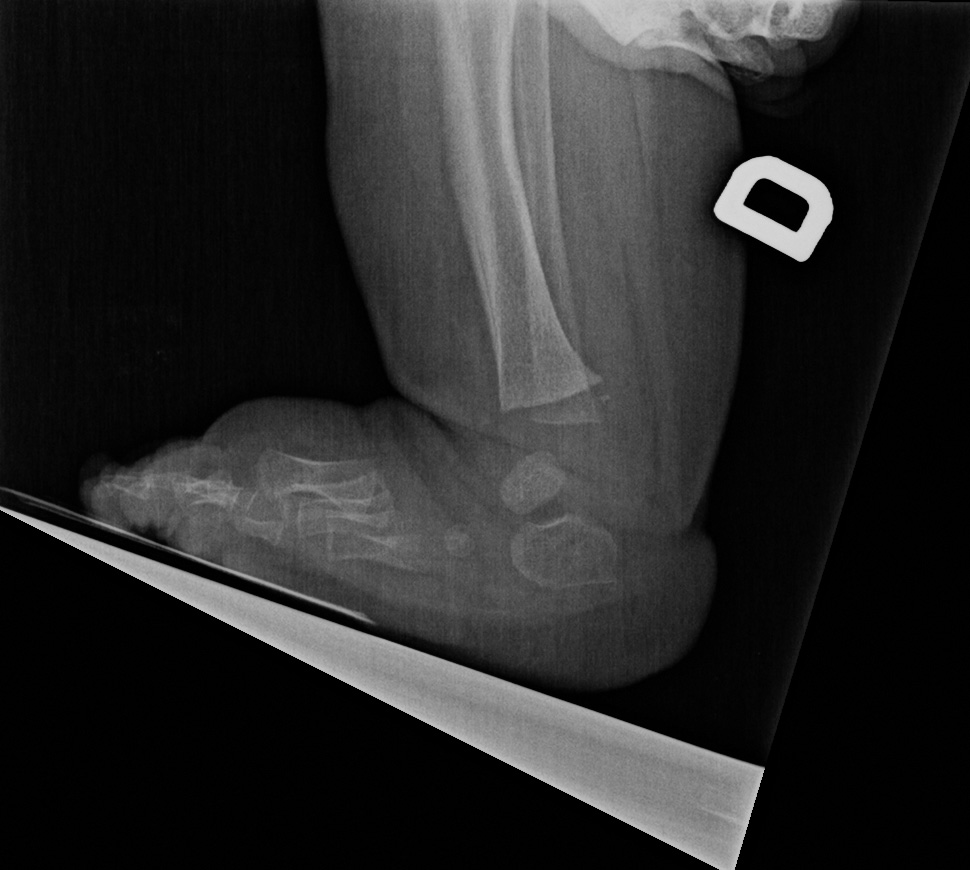 On the left side, the talus is not ossified enough to take measurements. Global alignment, however, suggests a left club foot of similar severity than the right.